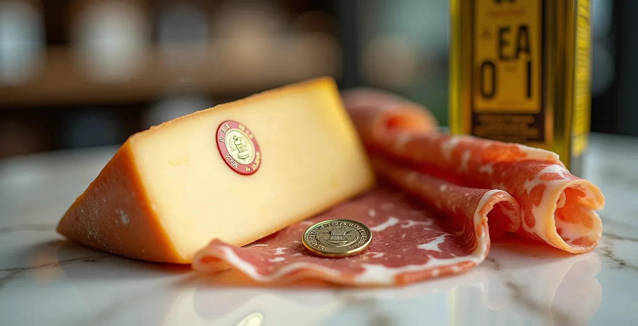 Prima di poter smascherare un’imitazione, è fondamentale comprendere il linguaggio dell’autenticità. I marchi di qualità europei non sono semplici adesivi, ma veri e propri contratti di fiducia tra il produttore, il territorio e il consumatore. Capire la loro gerarchia è il primo passo per un acquisto consapevole. Al vertice troviamo la Denominazione di Origine Protetta (DOP), identificata dal sigillo rosso e giallo. Questo marchio certifica che l’intero processo produttivo, dalla materia prima alla trasformazione, avviene in un’area geografica delimitata e secondo un disciplinare rigoroso. È il legame più forte e indissolubile con il terroir. Subito dopo viene l’Indicazione Geografica Protetta (IGP), con il suo sigillo blu e giallo. In questo caso, è sufficiente che almeno una fase della produzione avvenga nella zona geografica di riferimento per ottenere il marchio. Infine, la Specialità Tradizionale Garantita (STG) tutela non un’origine, ma una ricetta tradizionale, come nel caso della Mozzarella o della Pizza Napoletana.